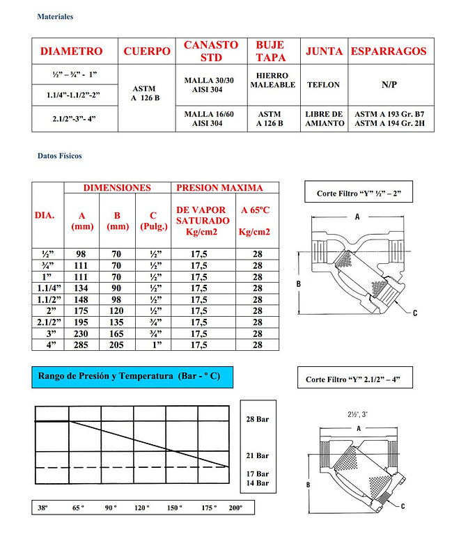 Los filtros y hierro conexión roscada  poseen un simple diseño y robusta construcción. Su gran área de filtrado implica que el mismo sea excepcionalmente eficiente. Sus partes internas son rápida y fácilmente accesibles. Los filtros tipo “Y” no solamente previenen el pasaje de material extraño, sino que constituyen un depósito donde éste es acumulado y luego fácilmente removido a través de su conexión de purga, la cual esta provista de un tapón roscado ó – a pedido se entregará-con una válvula para tal fin. Sus extremos de conexión pueden ser a bridas para soldar a tope buttweld (2″ – 12″), ó a enchufe sockettweld,o bien roscadas (1/2″ – 2″) NPT o BSPT. Los detalles constructivos pueden variar en función de las dimensiones y series. Para materiales posibles y una completa descripción de un filtro en particular comuníquese con nosotros.