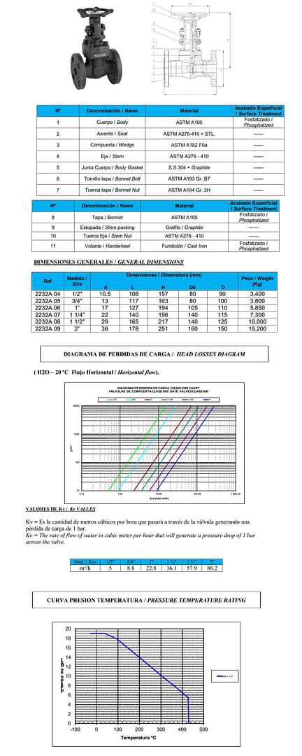 Válvula esclusa ASTM A105N Serie 800 Conexión Bridada Const. cuerpo y bonete acero forjado ASTM A105N.