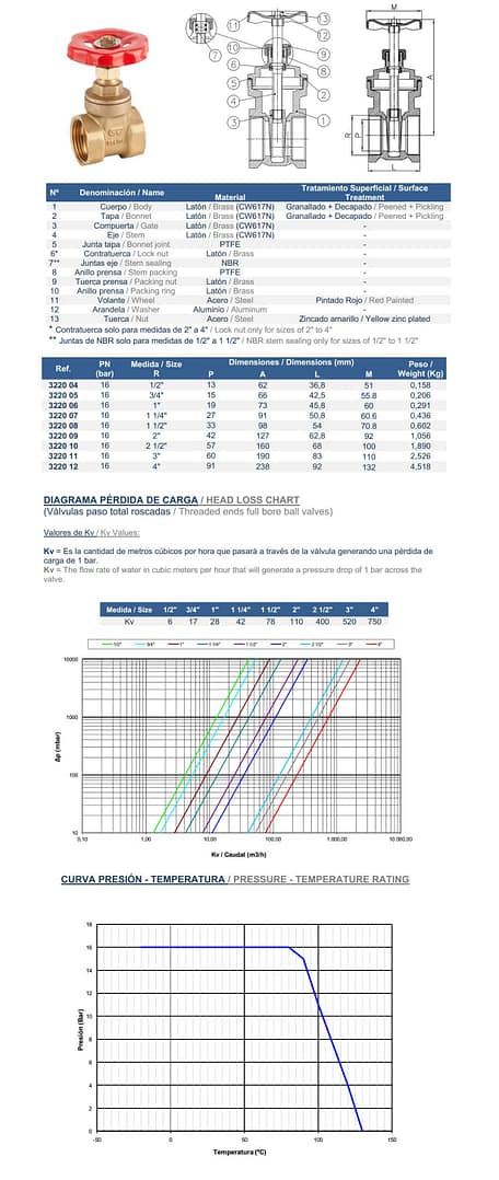 Válvula esclusa laton: PN 16. Paso reducido. Construcción en latón UNE-EN 12165. Temp. máx. 110ºC. Extremos rosca gas (BSP) H-H – ISO 228/1.