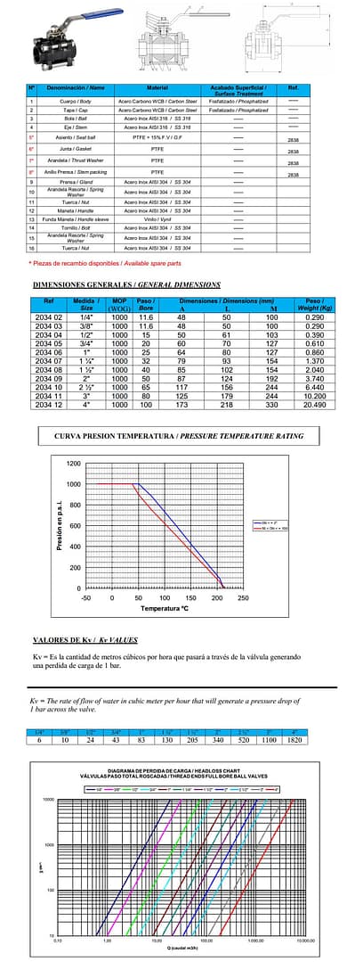 Válvula esférica 3 Cuerpos Acero al carbono:Const. acero al carbono “WCB” (microfusión). Esfera y eje inoxidable 316. Rosca gas ISO 7-1 (EN 10226-1). Asientos PTFE + 15% FV. 1000 wog. Temp. -25ºC +180ºC. Mando manual por palanca con sistema de bloqueo.