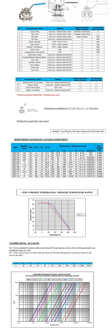 Válvula esférica 3 Cuerpos Acero inoxidable SW : Const.: acero inox. CF8M (316) microfusión. Juntas y asientos PTFE+15% FV tórica eje: vitón. PN 63. Temp. -25ºC +180ºC mando manual por palanca. Montaje directo s/DIN 5211 con sistema de bloqueo.