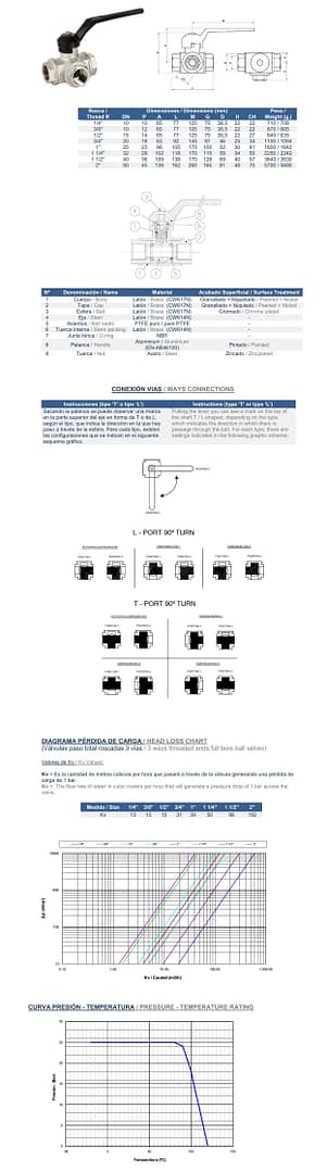 Válvula esférica 3 vías Tipo L PN 25. Paso total. Construcción en latón cromado UNE-EN 12165. Asientos PTFE. Extremos rosca gas (BSP) H – ISO 228/1. Obturador esférico en 2/3 vías en forma “T”. Juntas NBR. Temp. máx. 150ºC. Mando manual por palanca. Conexión a actuador ISO 5211.
