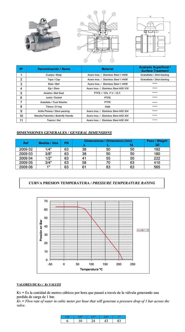 Válvula esférica Acero inoxidable mando tipo moño: Const.: acero inox. CF8M (316) microfusión. Extremos H-H rosca gas ISO 7-1 (EN 10226-1). Asientos PTFE + 15%. FV tórica eje viton. PN 63. Temp. -25ºC +180ºC. Mando manual por palomilla.